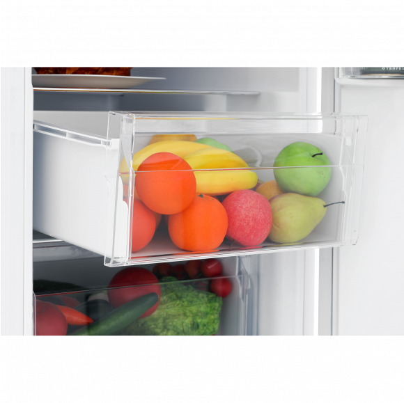 Разместить продукты можно на полках из закаленного стекла и ящиках для хранения овощей и фруктов, кроме того, в комплектацию входят подставка для яиц, полка для вина и лоток для льда.
