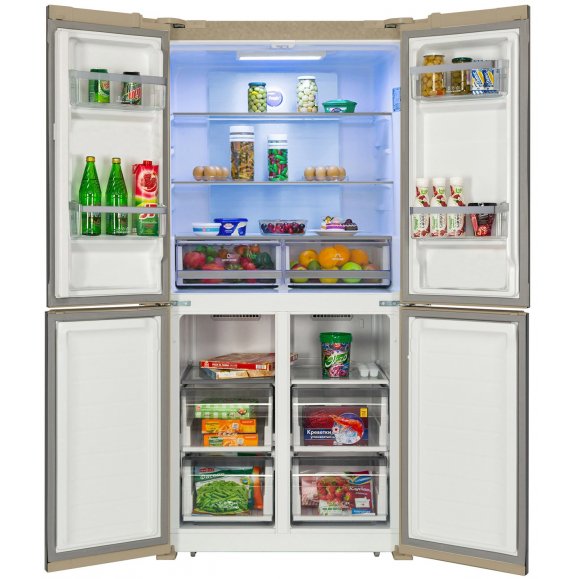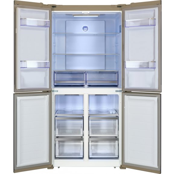 4-х дверный холодильник имеет общий объем 490 л, единое пространство верхних полок холодильной камеры, чтобы удобно было размещать габаритные кастрюли и контейнеры.