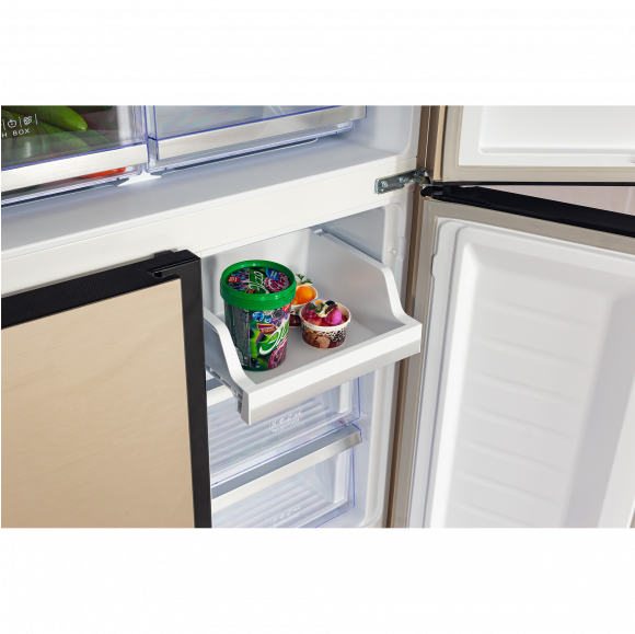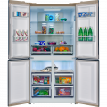 Холодильник состоит из морозильной и холодильной камеры повышенного объема. Общий объем составляет 545 л. Четыре двери позволяют получить доступ к продуктам, не выпуская холод из остальной части холодильника, благодаря открыванию дверь в дверь. В модели предусмотрены ящики для хранения овощей и фруктов, а также полки, выполненные из закаленного стекла, которые можно легко извлечь и очистить. Удобно и единое пространство полок холодильной камеры, которое позволяет размещать габаритные кастрюли и контейнеры.