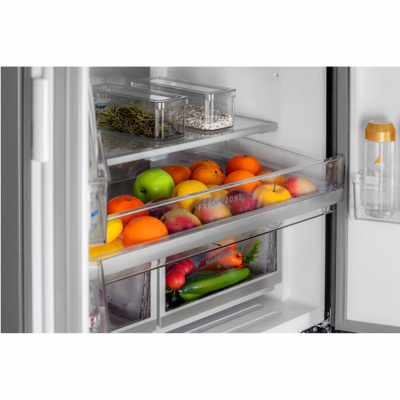 Глубина холодильника 60 см позволяет его свободно встроить в кухонный гарнитур, обеспечив минимальное расстояние до кухонных шкафов всего в 5 мм. А благодаря системе нижнего отвода тепла стенки соседних шкафов не будут нагреваться. Специальные дверные петли с обновленной конструкцией позволяют открывать дверь на 90 градусов, что обеспечивает удобный доступ к продуктам.
