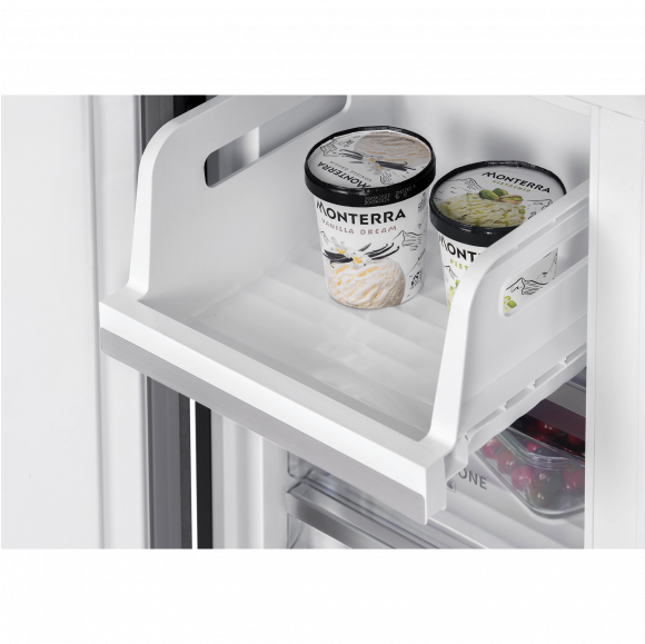 – полки внутри холодильной и морозильной камер выполнены из закаленного стекла и имеют пружинный замок — стабильная структура с премиальным внешним видом;
