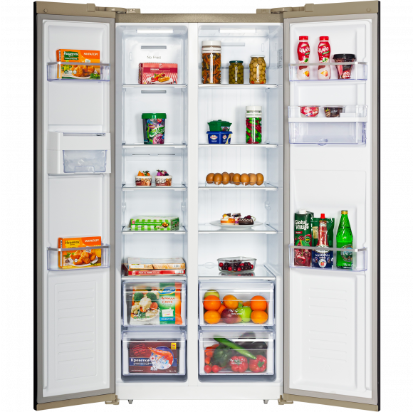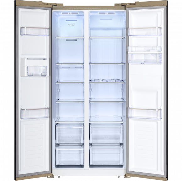 Отдельностоящий холодильник HIBERG RFS 484DX NFH INVERTER Side-by-Side оснащен двумя вместительными камерами: холодильная объемом 267 л и морозильная объемом 165 л. Особенность модели – наличие диспенсера для воды на фасаде двери.
