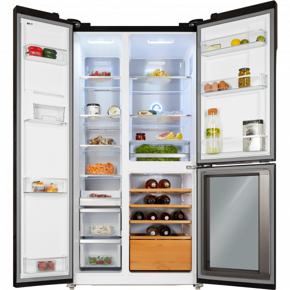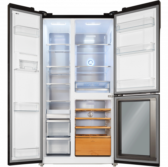 Отдельностоящий холодильник HIBERG RFS-700DX NFGB типа Side-by-side с общим объемом 630 литров и винным отделением предназначен для хранения большого количества продуктов и напитков в крупногабаритных квартирах, частных и загородных домах.