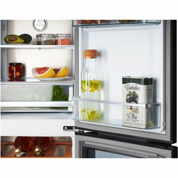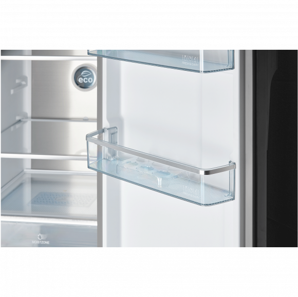 Холодильник оснащен LED-дисплеем с электронным управлением на дверце, что позволяет не открывать холодильник для изменения настроек температуры и режима работы. Внутрь не попадает теплый воздух, поэтому меньше расходуется электроэнергия, и дольше сохраняются продукты.