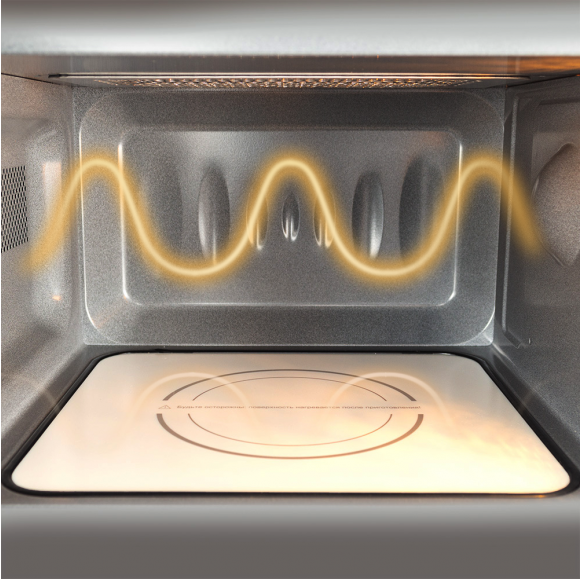 Микроволны подаются в камеру снизу через керамическое гладкое дно без поворотного стола, а затем равномерно распределяются по всему пространству, тем самым воздействуют на пищу со всех сторон, делая процесс приготовления или размораживания продуктов быстрым и эффективным.