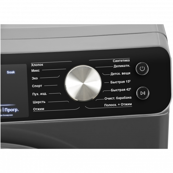 С помощью электронного типа управления можно выбрать необходимую программу с предустановленными настройками, отрегулировать температуру и время стирки. На LED дисплее световой индикацией отражается вся информация по режиму, часы, срок завершения стирки, закрытого люка, скорости отжима, температура, код ошибки, время окончания отложенной стирки и замачивания.