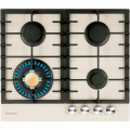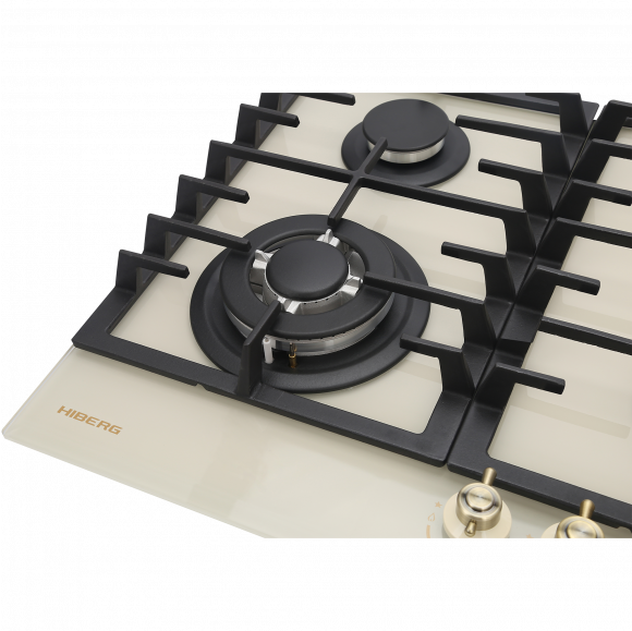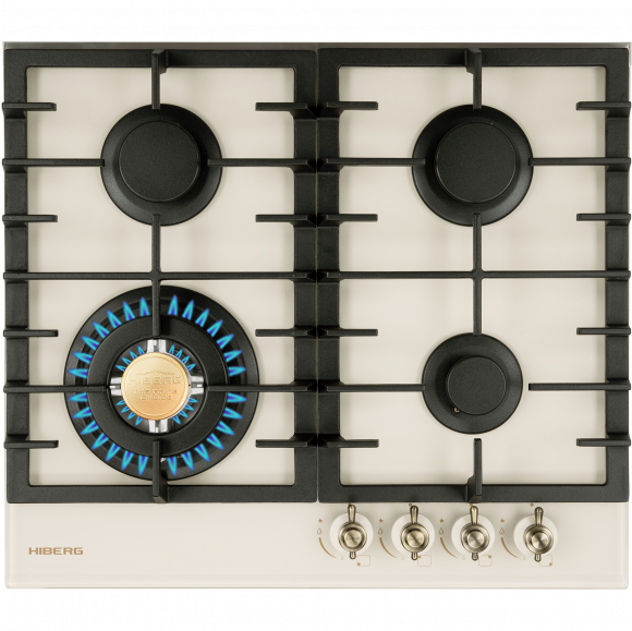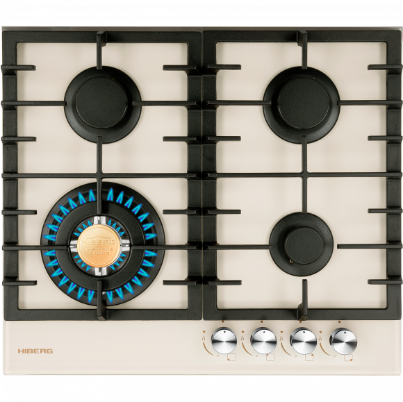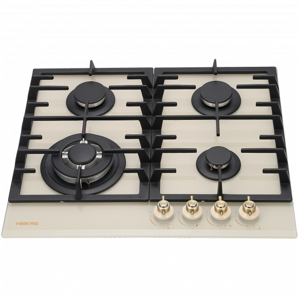 Газовая варочная поверхность HIBERG VM 60440 Y выполнена из закаленного стекла в бежевом цвете, оснащена 4 конфорками с функциями: автоматический «электророзжиг» и «газ-контроль».