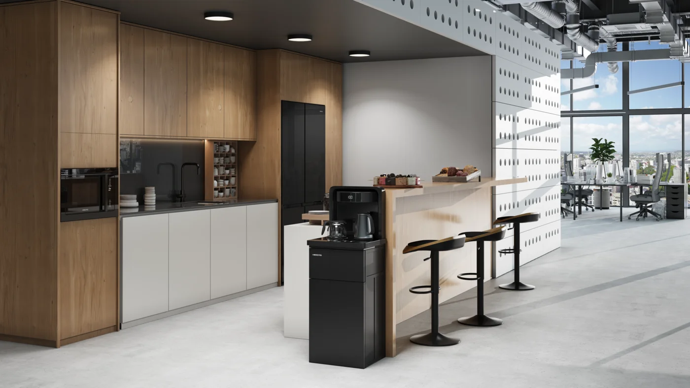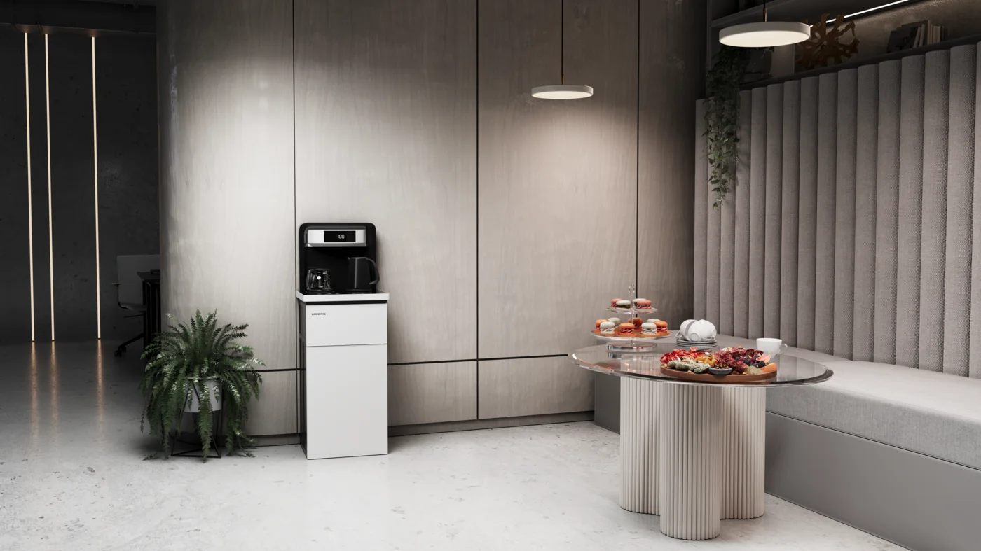 В коллекции HIBERG есть несколько моделей кулеров, которые обладают широким функционалом и при этом украшают интерьер. К примеру, этонапольный кулер HIBERG UFK 95 B с чайным столиком и компрессорным охлаждением. Стильная модель с фасадом из глянцевого чёрного стекла мотивирует пить воду чаще, азначит, помогает поддерживать оптимальный уровень воды в организме и хорошее самочувствие. Кроме того, это не просто кулер, а функциональный тиабар для любителей чая. На специальном столике установлены два чайника — электрический из нержавеющей стали и стеклянный заварочный. В первом температуру воды можно настраивать от 40°C до 100°C, а в заварочном чайнике поддерживается постоянная температура до 50°C.
