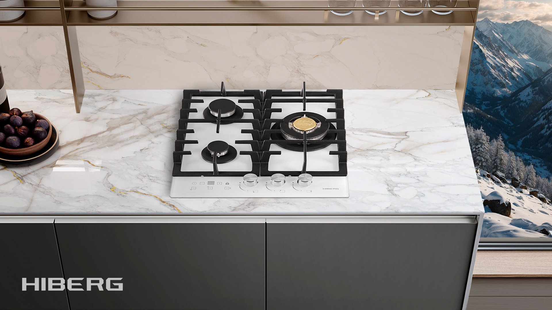 Такой поверхностью оснащена встраиваемая газовая варочная панель HIBERG VM 4535 W. Поверх конфорок в ней установлены чугунные решётки новой конструкции: соприкасаясь со стеклянной панелью только спереди и сзади, они не оставляют царапин и меньше нагружают стекло, защищая его от механических воздействий.