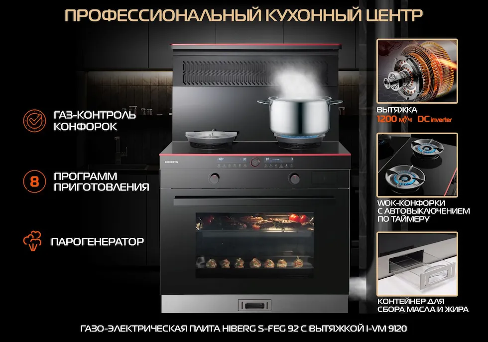 Газоэлектрическая плита HIBERG S-FEG 92 с вытяжкой i-VM 9120 и возможностью приготовления на пару – это инновационная техника, объединяющая в себе функции газовой варочной поверхности, электрического духового шкафа и вытяжки, созданная для того, чтобы сделать приготовление кулинарных шедевров легче и безопаснее.