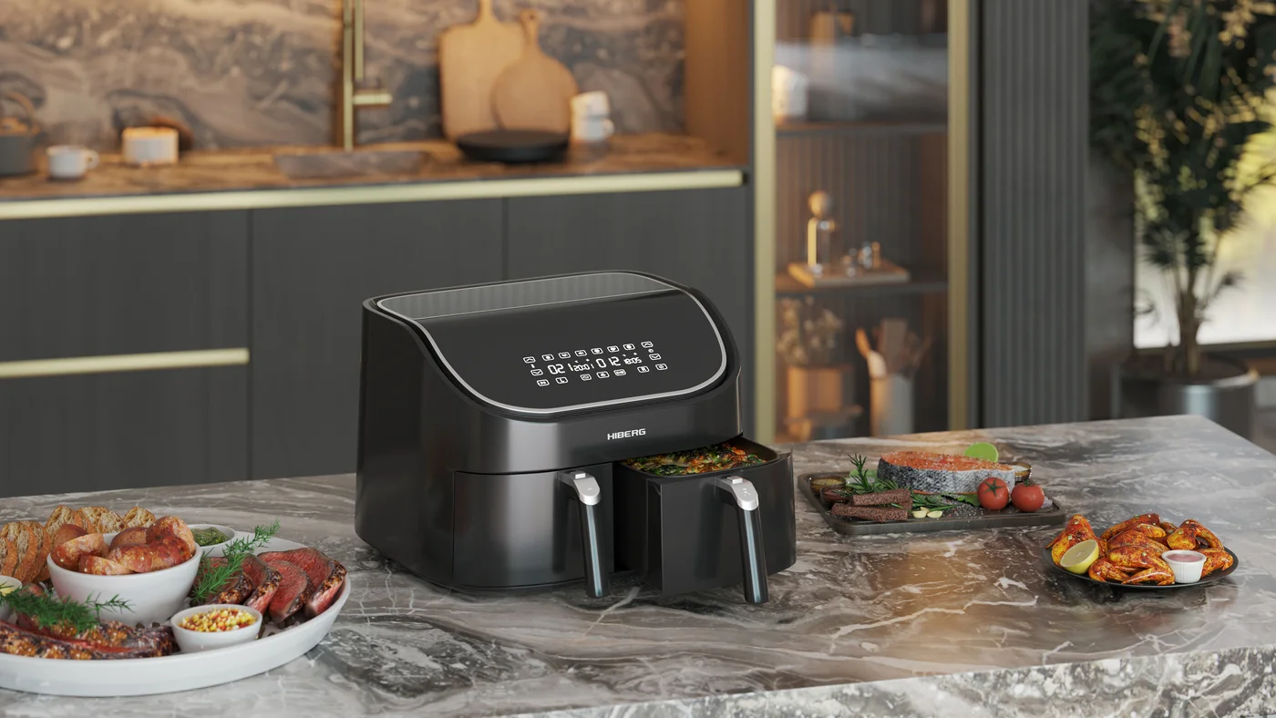В коллекции инновационного бренда HIBERG есть несколько моделей аэрогрилей, которые выполняют все вышеописанные функции. В их число входит и устройство HIBERG MGD 990 B с двумя независимыми чашами (на 3 и 6 л) для параллельного приготовления двух блюд.