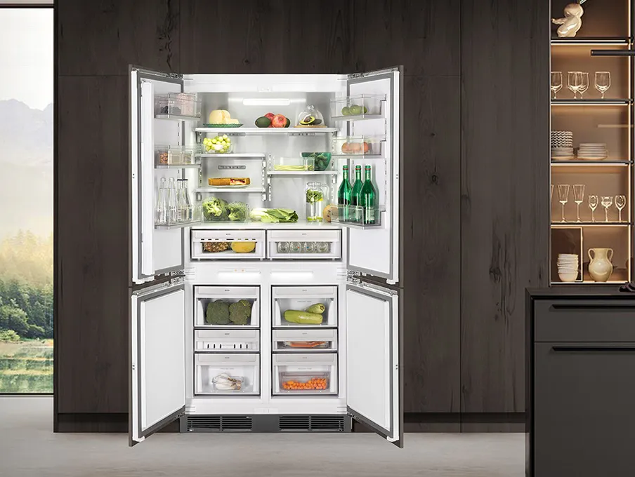 Уникальной особенностью модели стал ящик с индивидуальной зоной охлаждения (FLEX ZONE) объемом 12 литров, в котором можно настраивать температуру -4 °С, 0 °С или 4 °С. Это отличное решение, если вам захочется сохранить продукты без заморозки в течение нескольких дней. Также в холодильнике есть зона влажности, отдельный ящик для ультразаморозки в морозильной камере. Полки обоих отделений оснащены LED-подсветкой, улучшающей обзор продуктов. Все ящики оборудованы направляющими и доводчиками, поэтому открываются легким нажатием. Четыре двери также послушны – заботливо закрывают камеры холодильника.