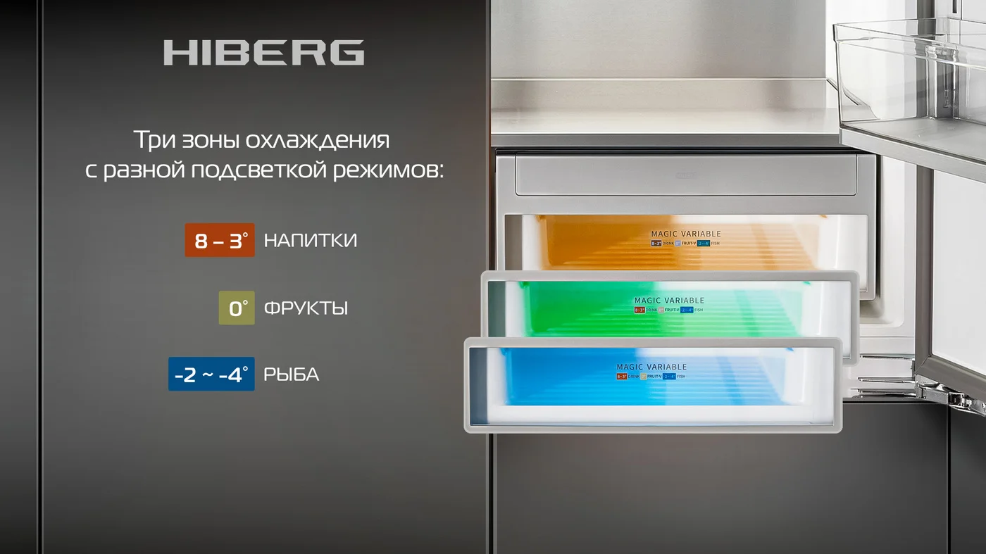 В моделях HIBERG S-RFQ 800 W inverter и HIBERG S-RFS 800 W inverter эта зона представляет собой отдельный ящик с индивидуальной настройкой температуры FLEX ZONE (3 режима).