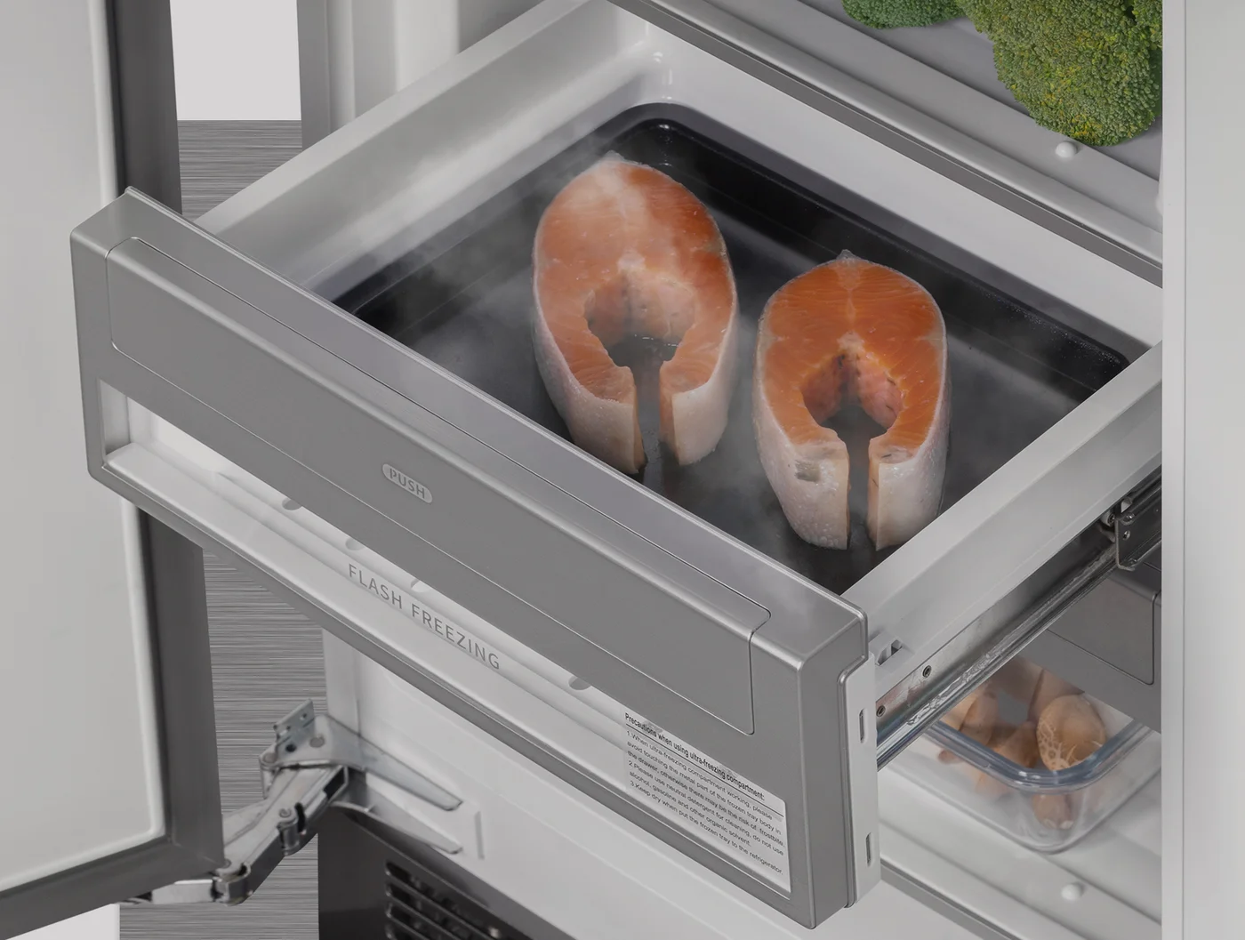 Для быстрой и удобной заморозки мяса, рыбы и других продуктов в морозильной камере предусмотрен ящик с металлическим подносом. Прочный и долговечный, он легко моется и не впитывает запахи, что снижает риск размножения бактерий и грибков. Помимо мяса и рыбы на нем можно аккуратно разместить овощи кусочками, грибы или ягоды – они замерзнут, не прилипнув друг к другу, и сохранят аппетитную форму, цвет и консистенцию.